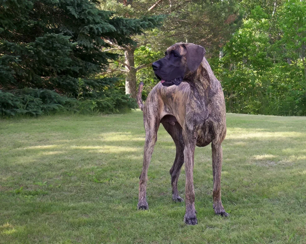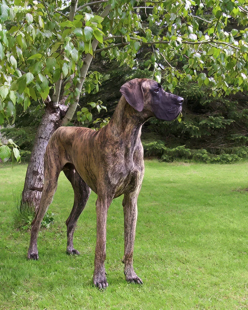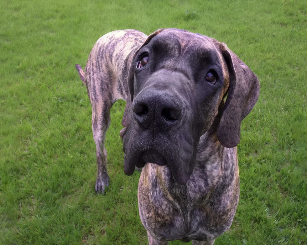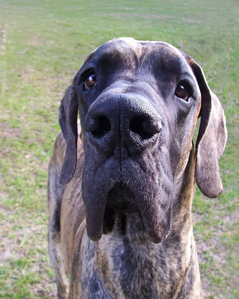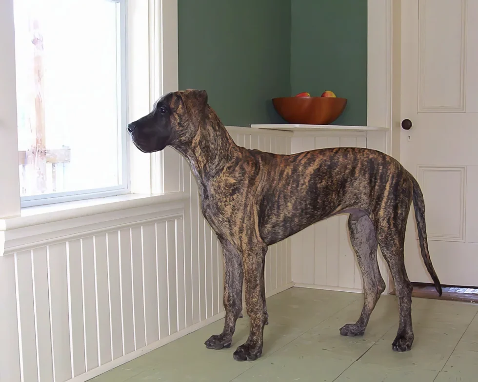 When Elliott was nine months old, his meagre confidence began to wane, and by one year of age, it was nothing but a memory. Elliott was a timid Dane, fearful of men, children, and small dogs. Elliott’s passion was women. He was a shameless flirt and never met a woman he couldn’t woo. At 12 months of age, Elliott stood 36 inches (91 cm) at the shoulder. He quickly realized that cleavage made an excellent chin rest, the kitchen sink was the perfect water bowl, and all laps were a personal invitation to sit.