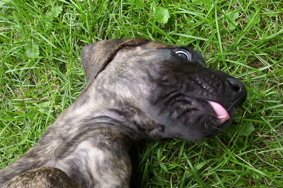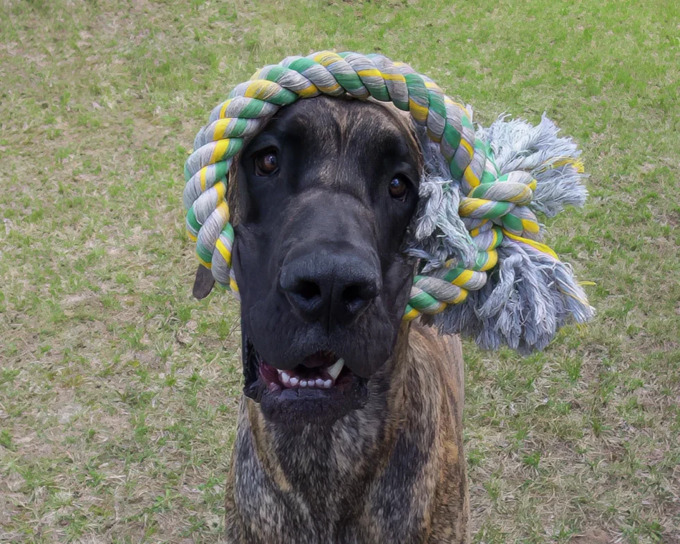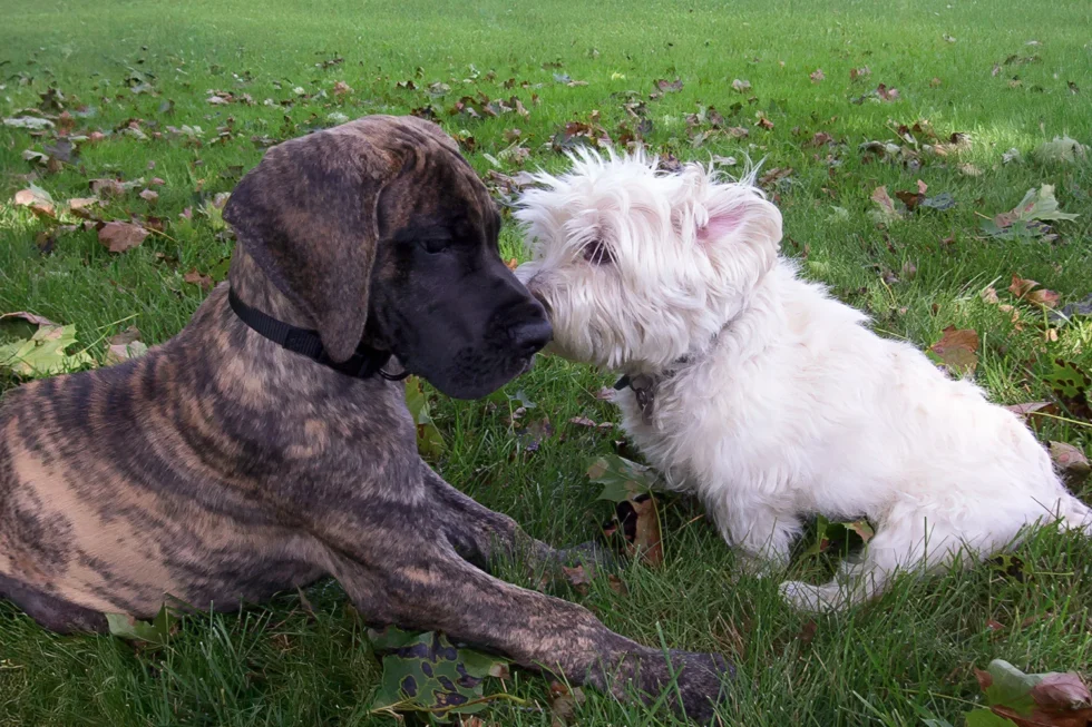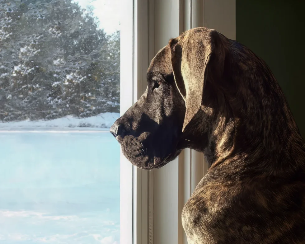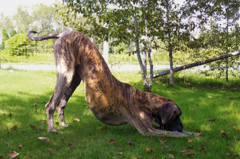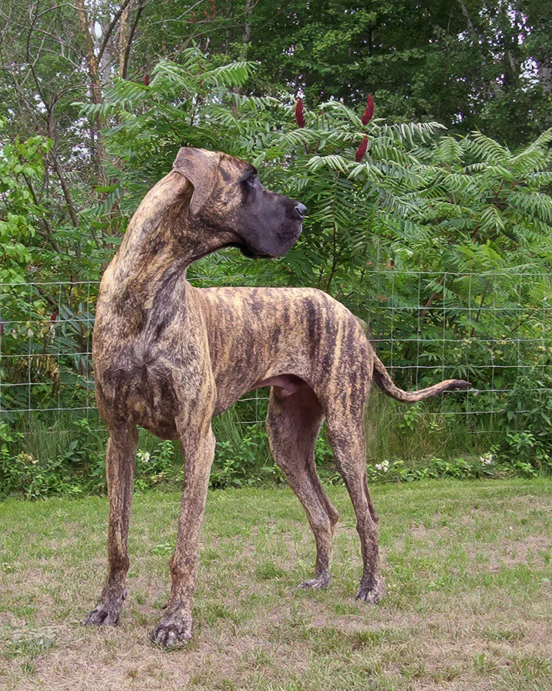When Elliott was nine months old, his meagre confidence began to wane, and by one year of age, it was nothing but a memory. Elliott was a timid Dane, fearful of men, children, and small dogs. Elliott’s passion was women. He was a shameless flirt and never met a woman he couldn’t woo. At 12 months of age, Elliott stood 36 inches (91 cm) at the shoulder. He quickly realized that cleavage made an excellent chin rest, the kitchen sink was the perfect water bowl, and all laps were a personal invitation to sit.